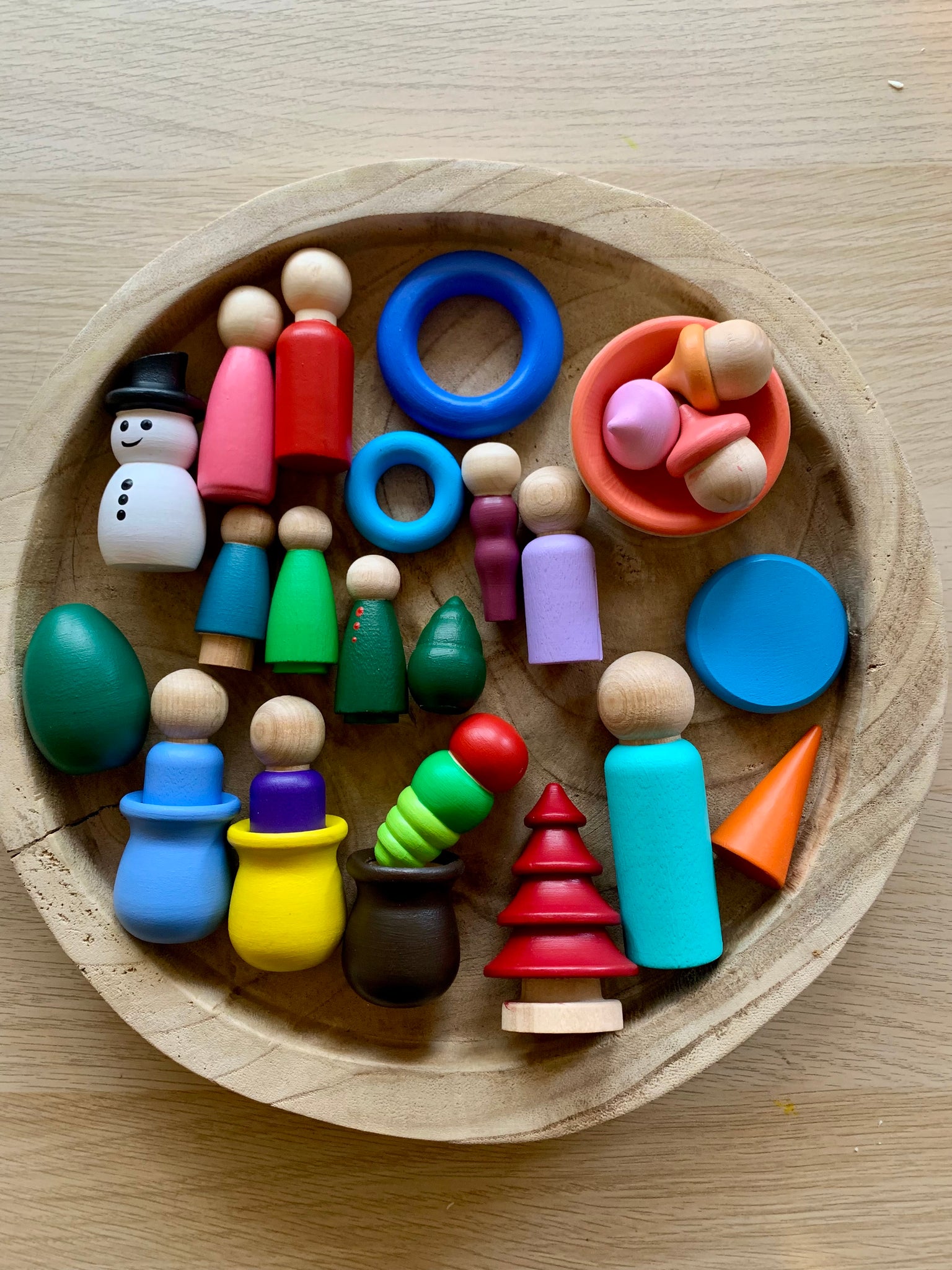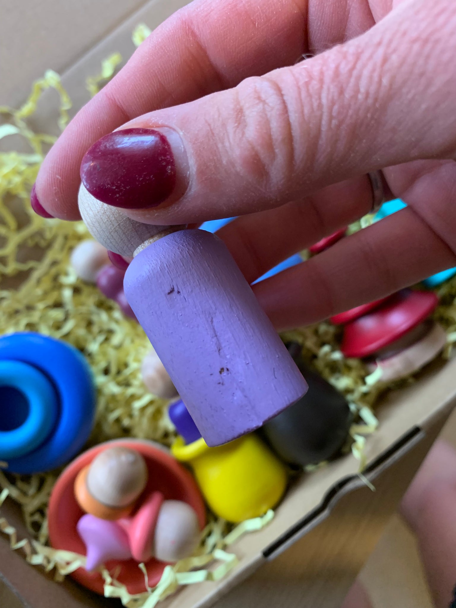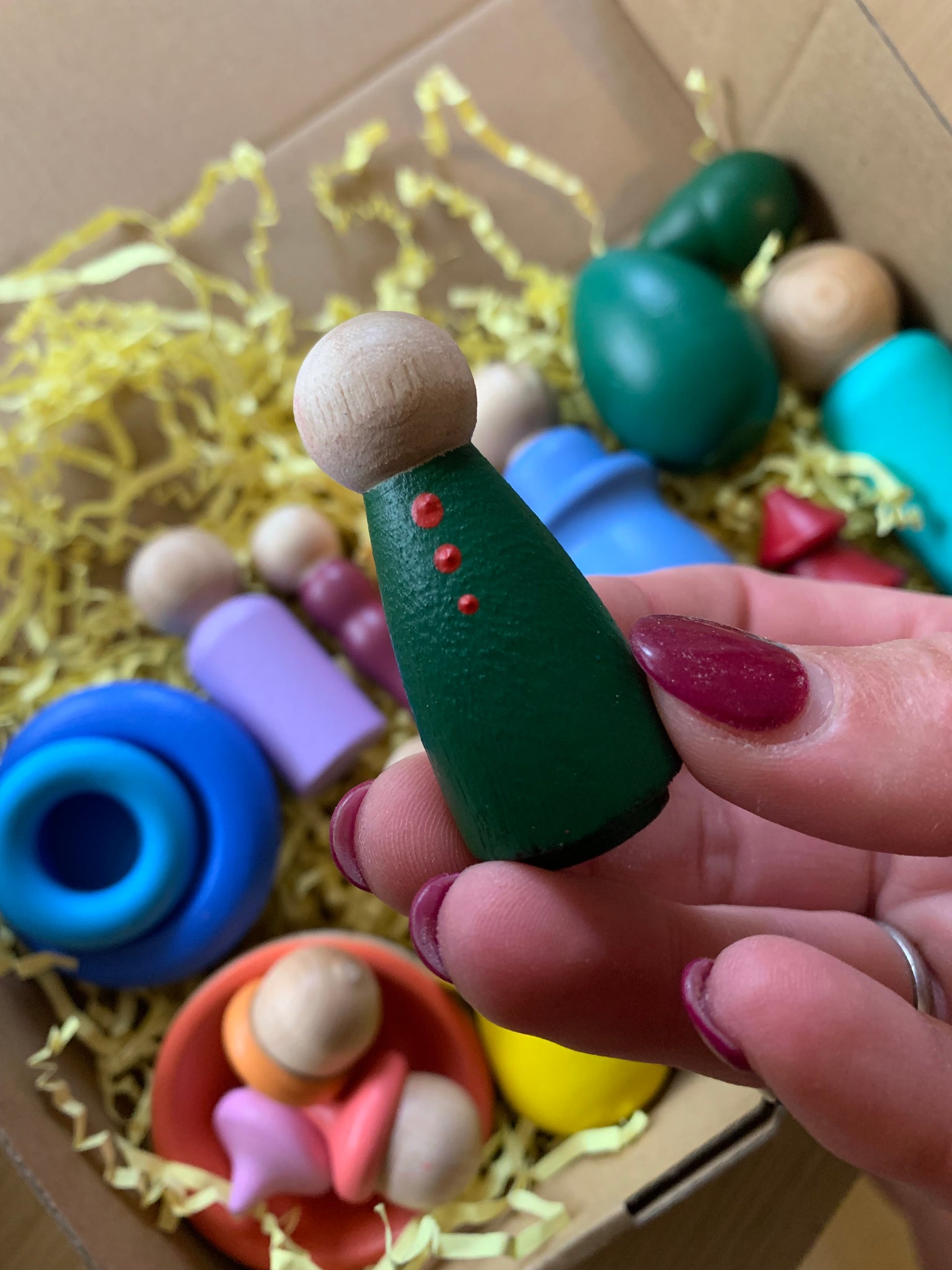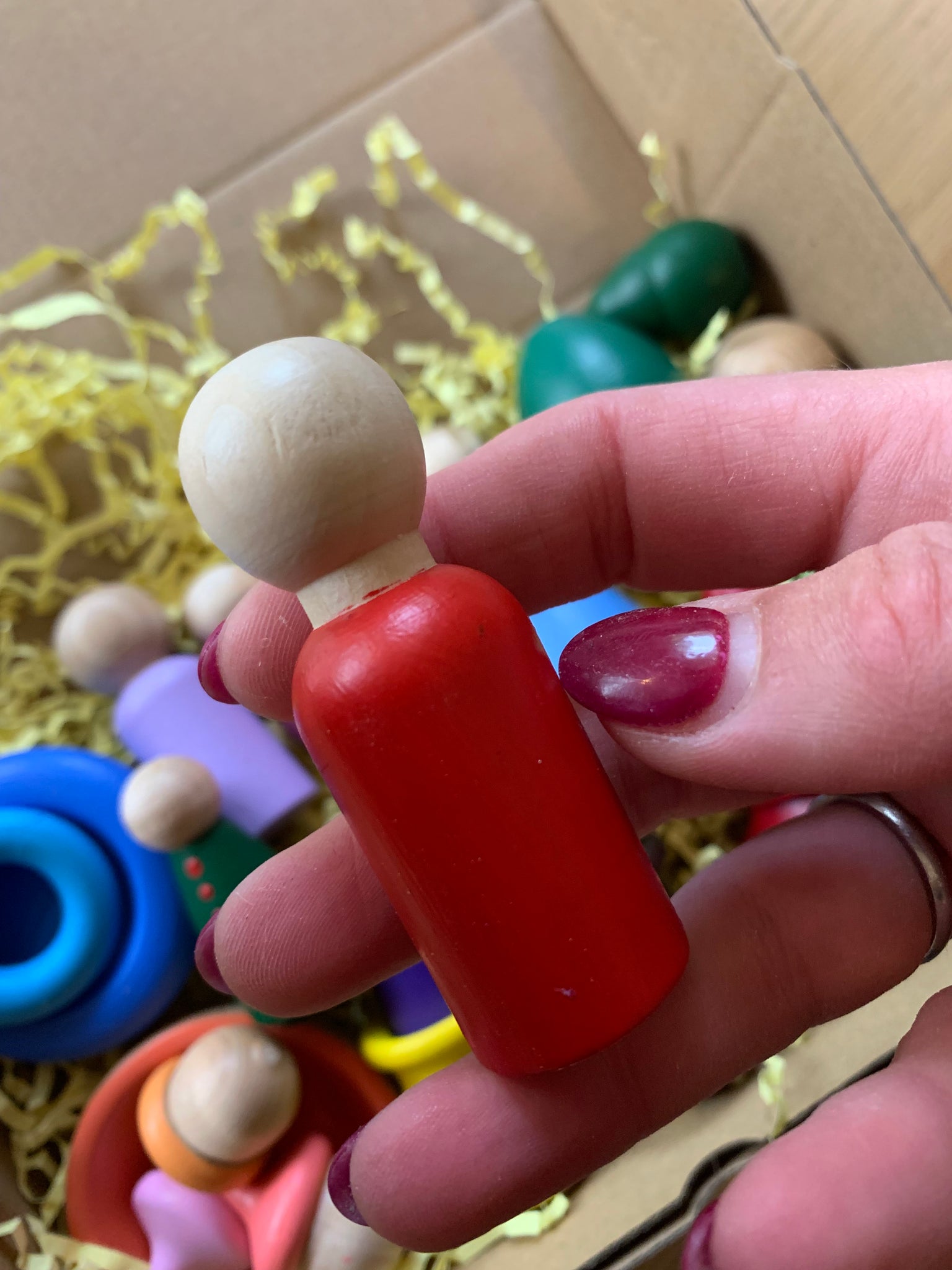 This box is full of Peg Dolls and loose parts! Some have minor faults others are perfect and may have been painted with a sample colour!