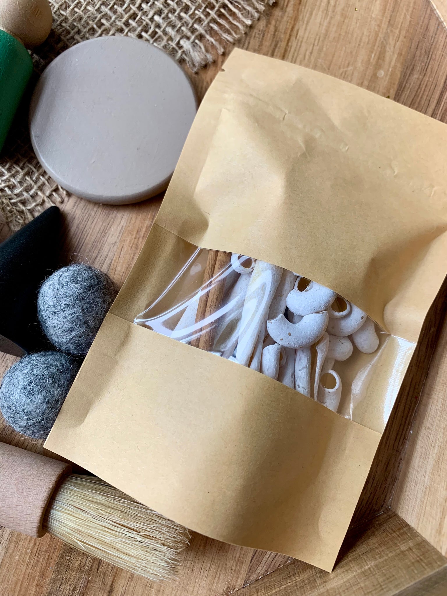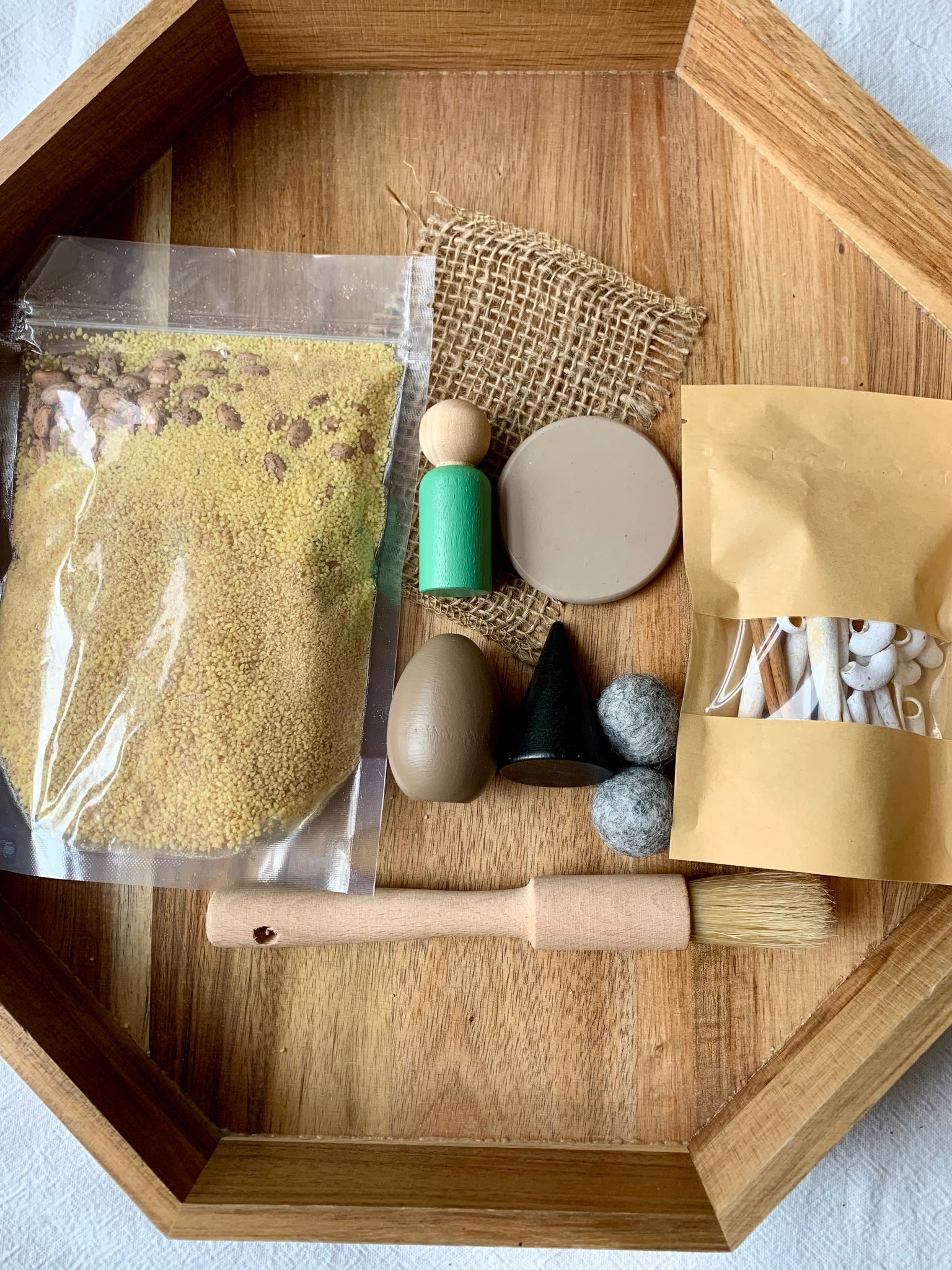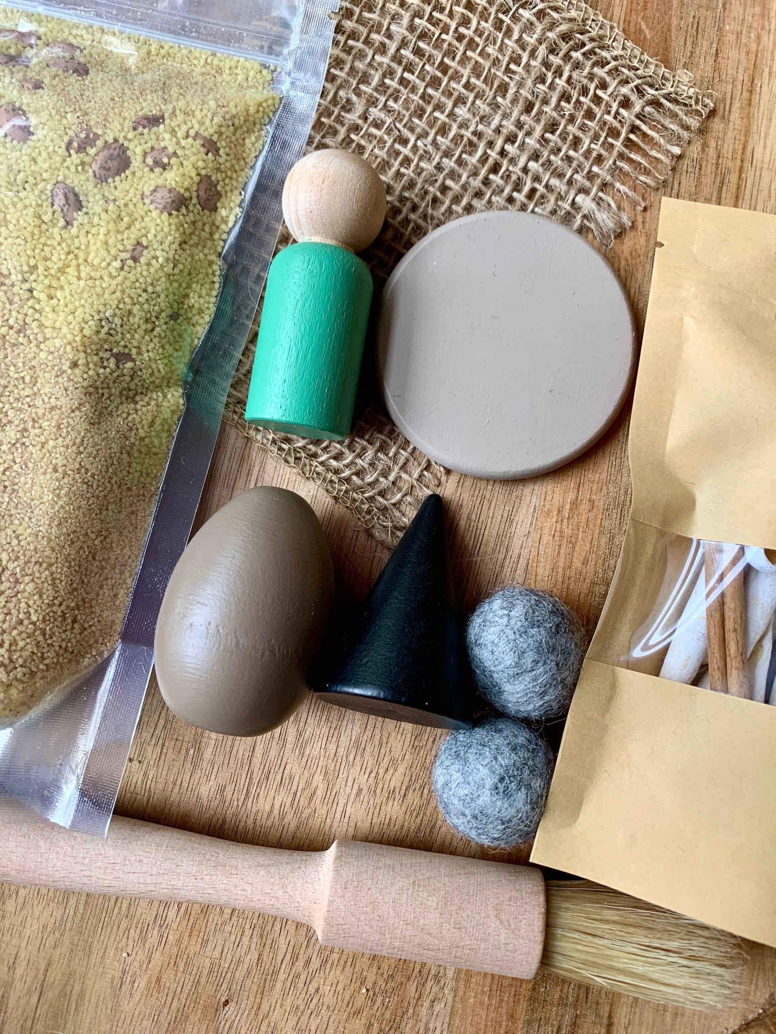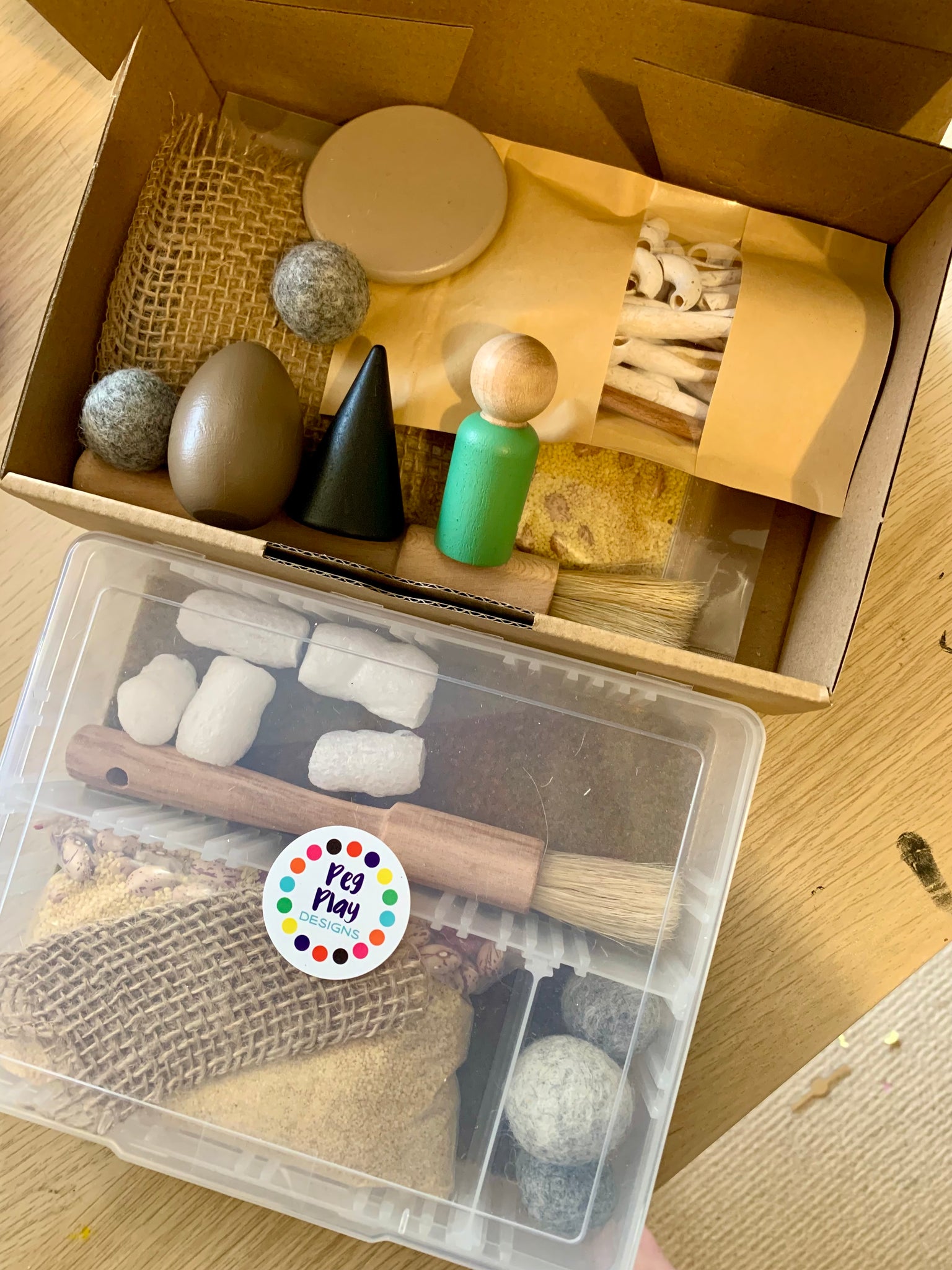 Included in each box are hand painted peg dolls, a wooden tool, sensory base and accessories.